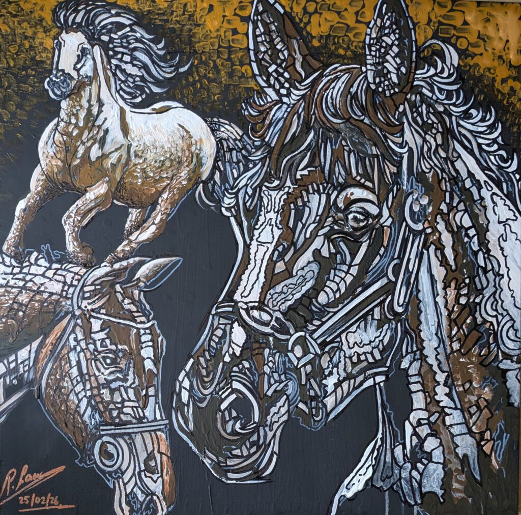 Dancing with the Wild Horses << Naar vorig schilderij Afmetingen: 80 bij 80 cm Aqrylverf en tekenmarkers >>Naar volgend schilderij