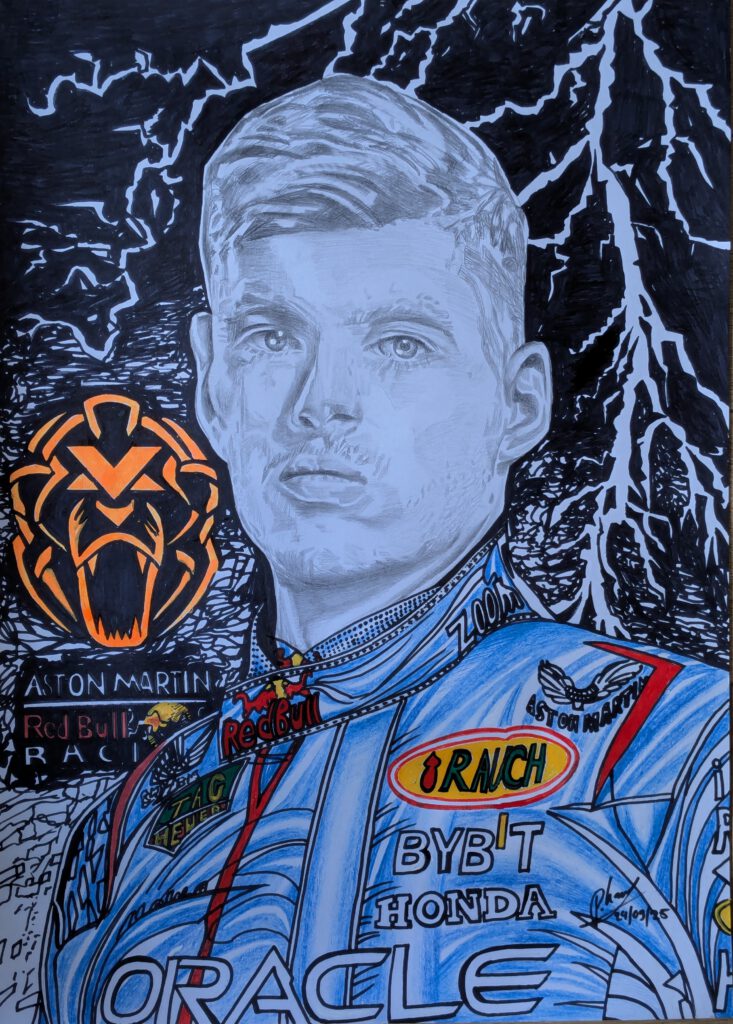 Max Verstappen >>Naar vorige tekening Tekening met grijs potlood, fineliners en kleurpotloden. Afmeting 71 bij 51 cm.