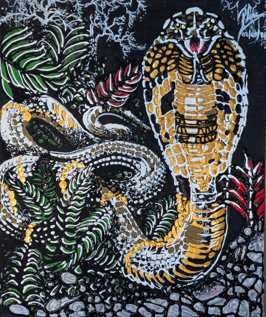 The Cobra <<Naar vorig schilderijAfmetingen 50 bij 60 cm Aqrylverf en tekenmarkers>>Naar volgend schilderij