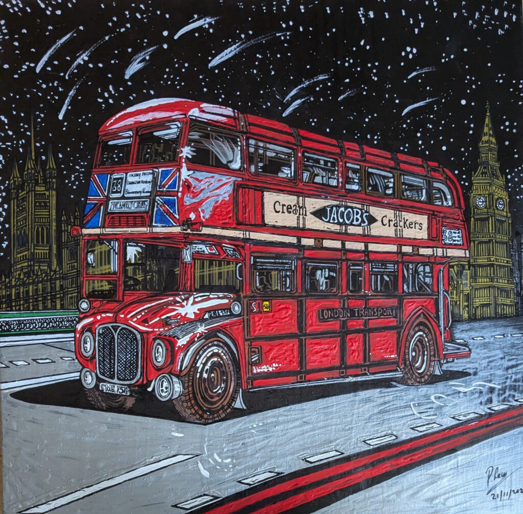 The Double Decker Bus <<Naar vorig schilderijThe Double Decker Bus Afmetingen 80 bij 80 cm Acrylverf met tekenmarkers