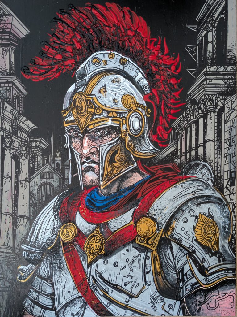 The Roman Centurion << Naar vorig schilderij The Roman Centurion Afmetingen 60,5 bij 81 cm Acrylverf met tekenmarkers >> Naar volgend schilderij
